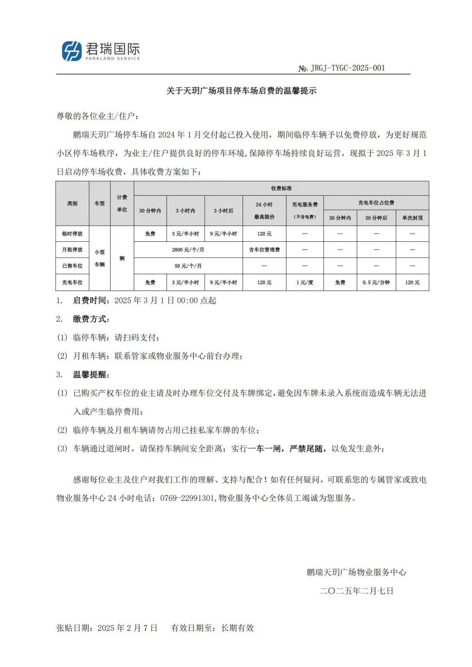 2月7日,鹏瑞天玥广场物业服务中心发布了《关于天玥广场项目停车场启费的温馨提示》,该通知表示,为更好规范小区停车场秩序,为业主/住户提供良好的停车环境,保障停车场持续良好运营,拟于2025年3月1日启动停车场收费。