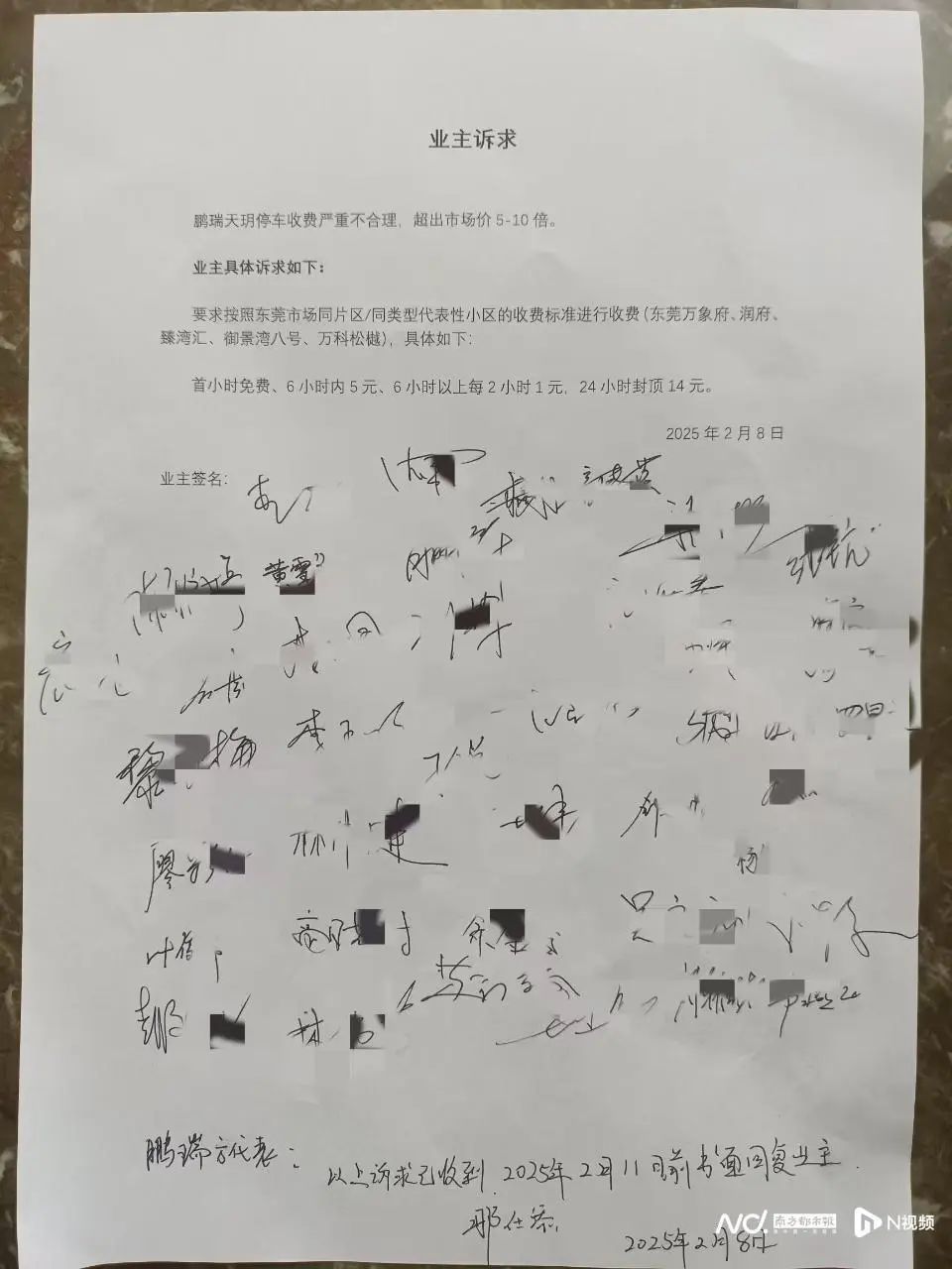 当天现场,鹏瑞天玥业主们对于停车费提出了诉求并集体签名,希望按照东莞市场同片区/同类型代表性小区的收费标准进行收费(东莞万象府、润府臻湾汇、御景湾八号、万科松樾),具体如下:首小时免费、6 小时内5元、6 小时以上每2 小时1元,24 小时封顶 14 元。“同类型小区收费标准月租是400元左右。”李先生如是说。
