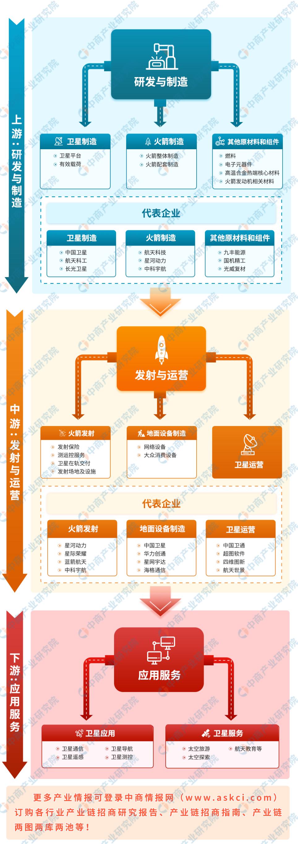 商业航天产业链上游是火箭制造、卫星制造及相关配套设备;中游为卫星发射、地面设备制造和卫星运营;下游为终端应用及服务市场,传统应用场景包括通信、导航、遥感,新兴应用场景包括卫星互联网、太空旅行、太空采矿、深空探索等。
