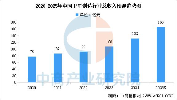 近年来,在空间基础设施建设加速及技术进步的推动下,中国卫星制造行业市场规模保持稳定增长。中商产业研究院发布的《2025-2030全球及中国人造卫星行业发展现状调研及投资前景分析报告》显示,2024年中国卫星制造行业总收入达到132亿元,近五年年均复合增长率为11.1%。中商产业研究院分析师预测,2025年中国卫星制造行业总收入将达到166亿元。