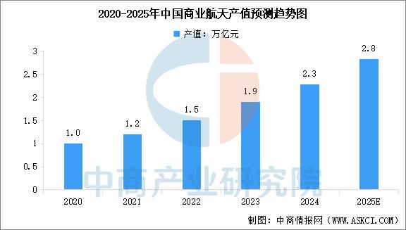 近年来,中国政府积极鼓励商业航天行业发展。中商产业研究院发布的《2025-2030年中国商业航天行业深度分析及发展前景研究预测报告》显示,中国商业航天行业产值由2020年1万亿元增至2024年的2.3万亿元左右,复合年增长率为22.9%。中商产业研究院分析师预测,2025年中国商业航天行业产值将达到2.8万亿元。