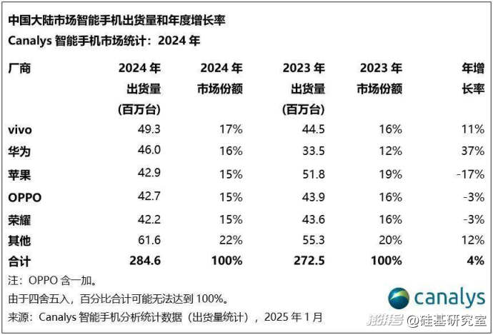据机构Canalys发布的数据,在中国大陆市场,过去一年来,按照出货量计算,vivo以17%的份额位列拿下第一,华为紧随其后,而苹果仅位列第三,用本土化的「Apple Intelligence」撬动中国市场,无疑也是库克想要看到的。