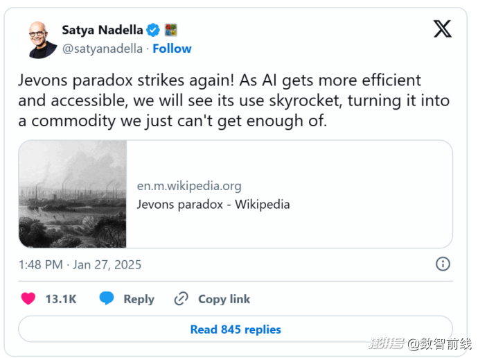 微软CEO纳德拉甚至在DeepSeek R1发布后,在凌晨发文:“杰文斯悖论再次应验!随着AI变得更高效、更容易获取,它的使用量将火箭般蹿升,成为我们用不够的商品。”