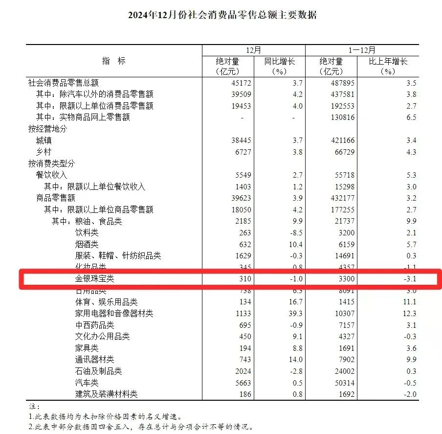 天眼查显示,据国家统计局发布的社零数据,2024年,全国限额以上金银珠宝零售总额为3300亿元,同比下降3.1%,是16个类目中降幅最大的“差等生”。