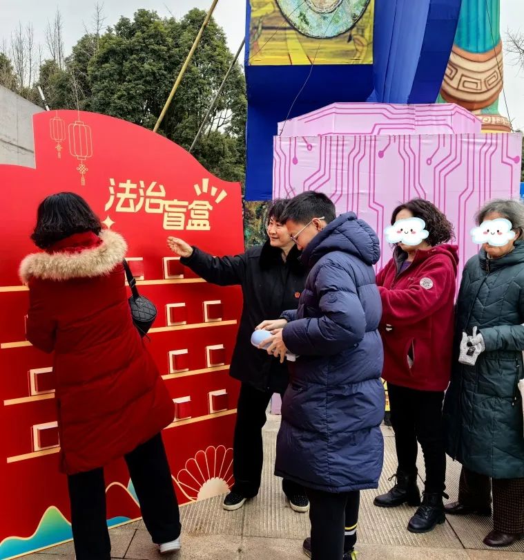普法互动区域人气爆棚,“游玩+学法”两不误。在趣味打卡区,生动有趣的宣传标语、活泼可爱的普法形象,节日法治氛围感拉满,吸引了各个年龄段的游客驻足。通过鼓励游客参与微信朋友圈“拍照打卡”、关注普法公众号等形式提升活动的参与感、体验感,让游客们真切感受到自己也是法治建设中不可或缺的一员。“游客发现导游无证上岗,应该向文化旅游部门举报。”“答对了”。普法活动现场传来阵阵欢呼,这是普法互动区域的另一游戏:法治盲盒。游客通过选择心仪盲盒回答对盒内问题即可获得小礼品,这种新颖的普法方式激发了游客们的学法兴趣。游戏过程中还有参与者在遇到难题时直接求助现场观众,在大家的支招和和普法法官的解答中增进了对法律法规的理解。