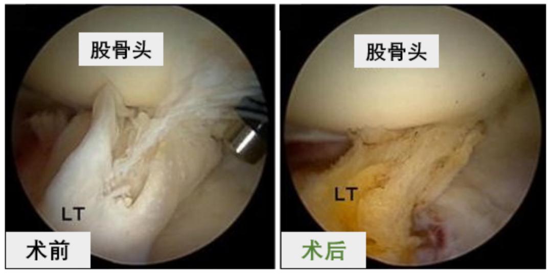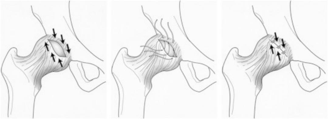 髋关节镜下圆韧带清理术前术后对比③髋关节囊折叠紧缩缝合术