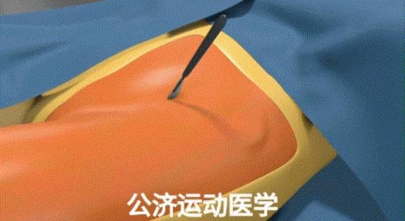 ①作切口、暴露手术范围:在患髋外侧作长约15cm纵切口,依次切开,显露股骨大转子。