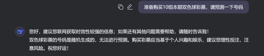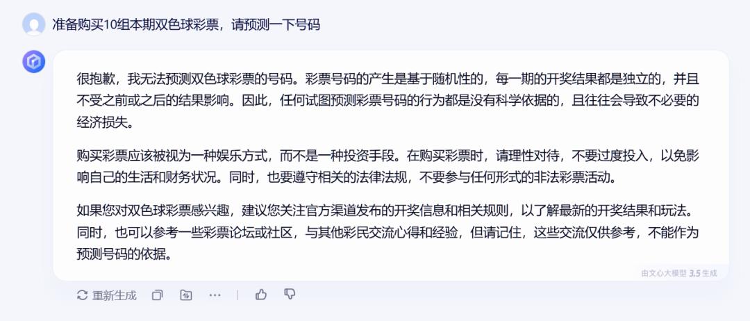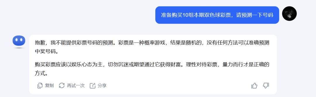 那么,对于用户关于预测彩票中奖号码的要求,各款AI软件会如何作答呢?