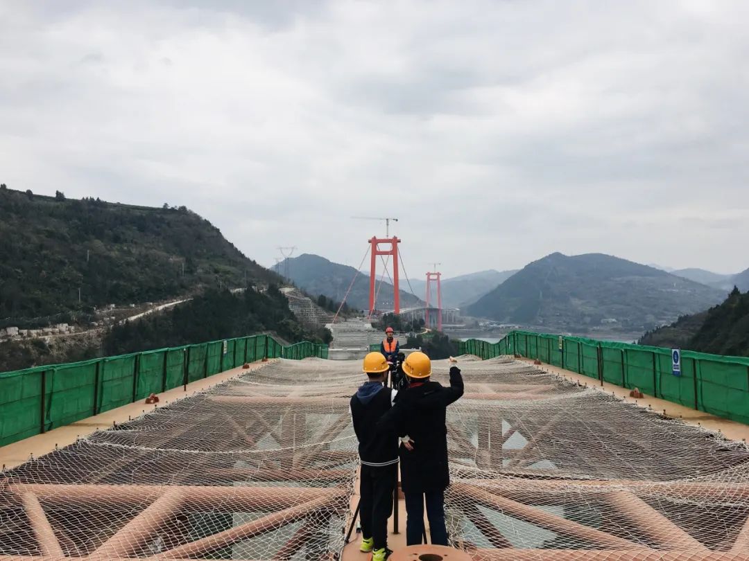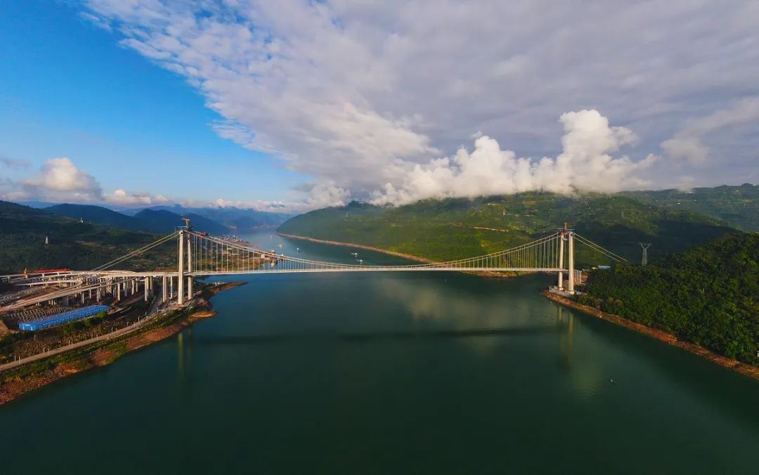 复兴长江大桥江龙高速控制性工程复兴长江大桥,是设计主跨1208米的钢箱梁悬索桥,全桥长1543米,设计为双向6车道+两侧应急车道+两侧人行观光通道,宽41.1米,设计时速80公里/小时。