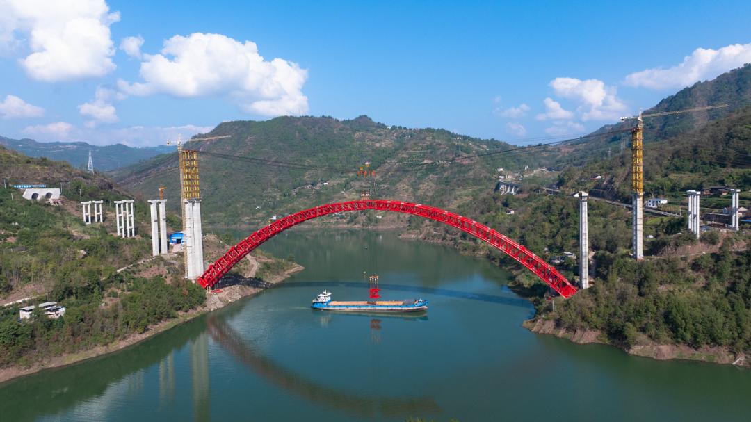 磨刀溪特大桥磨刀溪特大桥全长828米、宽25.5米、主跨340米、主墩高75米,是一座钢管混凝土拱桥,跨越长江支流磨刀溪,拱上立柱及盖梁采用钢结构箱型截面,桥面系采用15米×24米连续T梁。