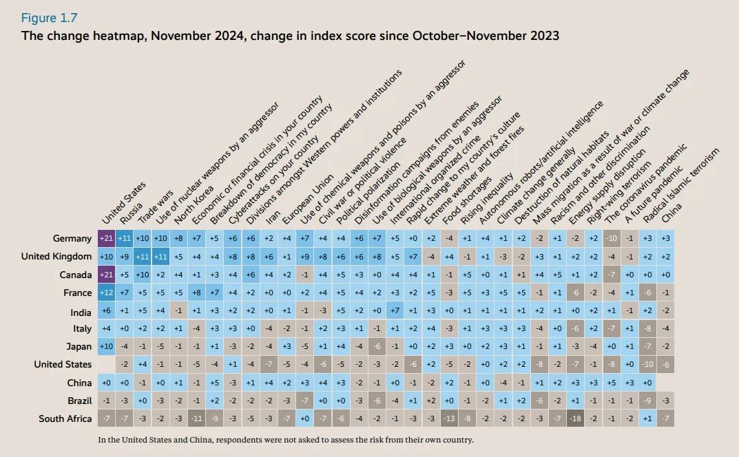 报告也在分析内容中直接挑明,“特朗普当选后,G7国家,尤其是德国和加拿大,以及(金砖国家的)印度,对美国构成的风险感知急剧上升(increased sharply)。”
