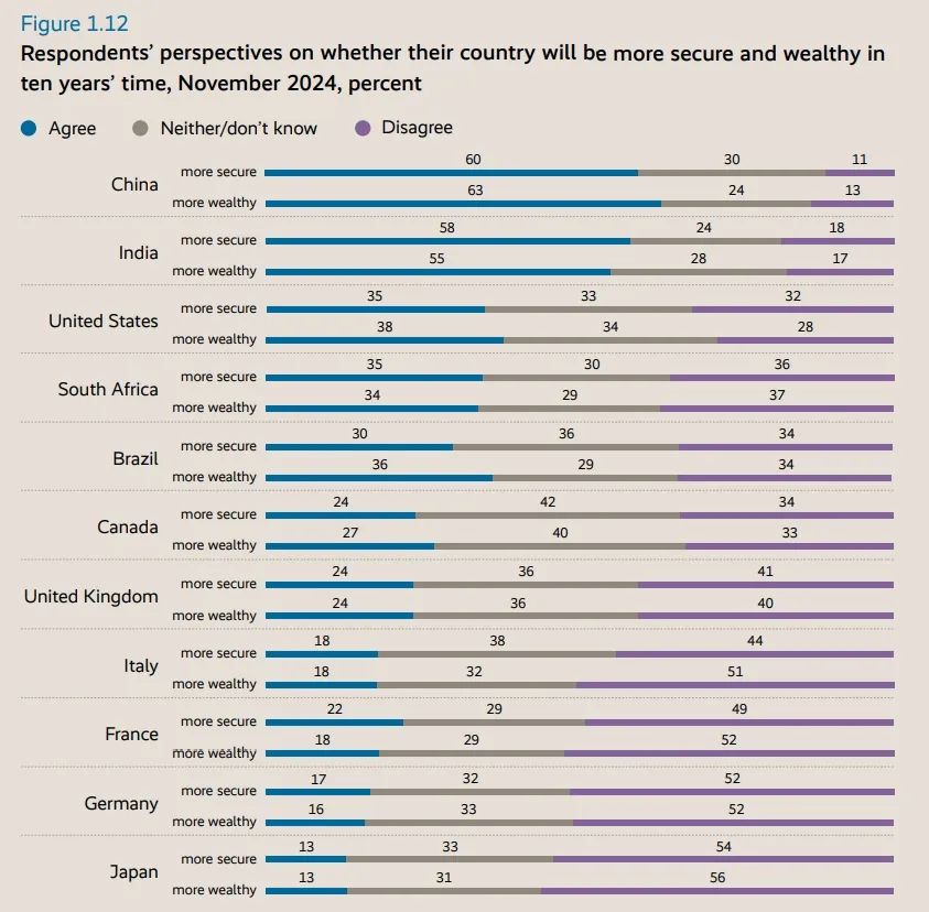 数据显示,除了美国,G7中没有任何一个国家认为自己在未来十年后会更安全、更富裕。报告认为,这种悲观态度深刻反映了西方一种“普遍的衰退感”。而中国受访者赞同这两项的比例高居第一且均超过六成。