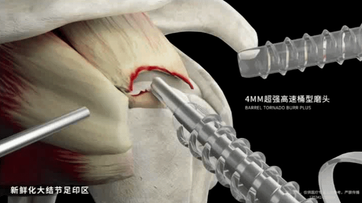 清理肩峰下滑囊并修整撕裂的肩袖边缘。为促进修补后肩袖的愈合,在肩袖止点的肱骨大结节处,做新鲜化处理。