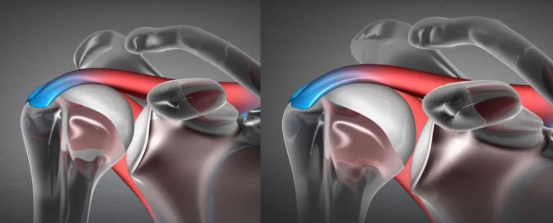 相关研究认为95%肩袖损伤是长期肩部撞击、磨损引起。随着年龄增大及关节炎发生,肩峰可能出现骨刺,使肩峰下间隙进一步狭窄。当肩关节在做前屈及外展运动时,肩峰前缘及喙肩韧带与肱骨大结节发生撞击,引发肩峰下滑囊炎症,发生肩袖撕裂。