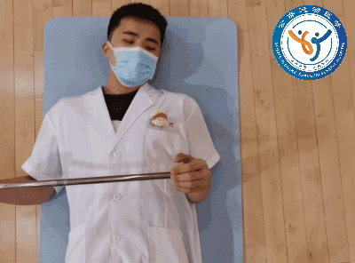 动作要领:准备一根80-100cm左右的硬质棍状物。仰卧位,患侧肘关节紧贴躯干,屈曲90度,两手掌心相对握持棍棒。用健侧手将患侧手向外侧推开,使其外旋。动作全程保持上臂贴近躯干以及肘关节屈曲。推至感到能忍受的疼痛为止,稍作停留3-5秒后放松回位。训练频率:一天2-3组,每组10-15次。