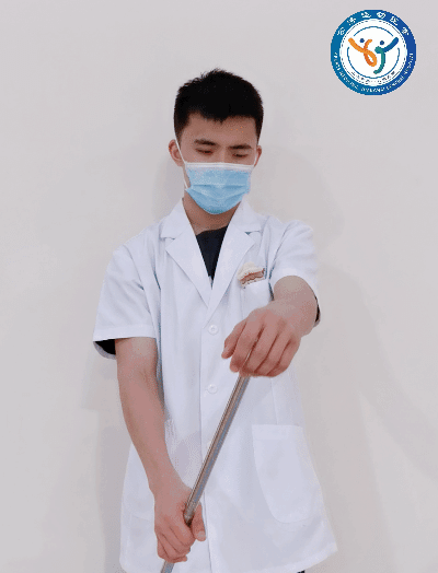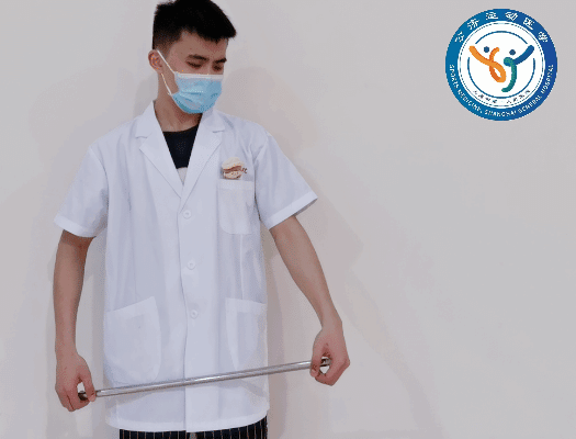 动作要领:可以借助一根1.2-1.5米左右的硬质棍棒进行棍棒活动度练习。患侧肘关节伸直,用健侧手将患侧肩关节往前往上推,推至感到能忍受的疼痛为止。训练频率:一天2-3组,每组10-15次。