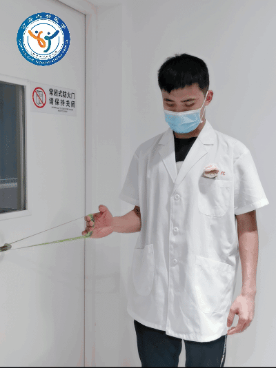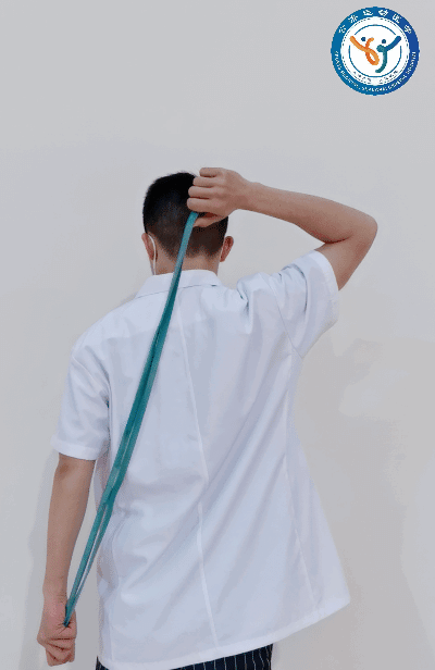 动作要领:使用弹力带或毛巾绕至后背,类似于“搓澡”动作,患侧手在下,健侧手在上,利用健侧的上肢将患侧手向上拉起。训练频率:一天2-3组,每组10-15次。