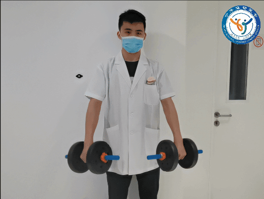 动作要领:患侧手臂适当远离身体,轻轻将患肩耸向耳边,直到感到轻微酸胀。训练频率:每次坚持5秒,10次一组,每日3组。