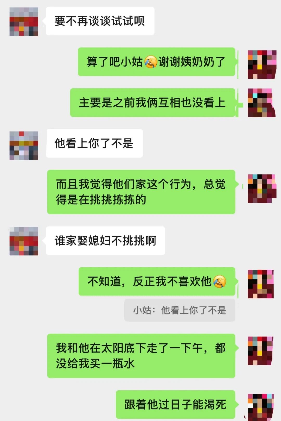 曾经有一个人,通过介绍人打听我有没有产假。还有一个人,看我态度冷淡,直接开始发房子照片,然后把我拉黑了。