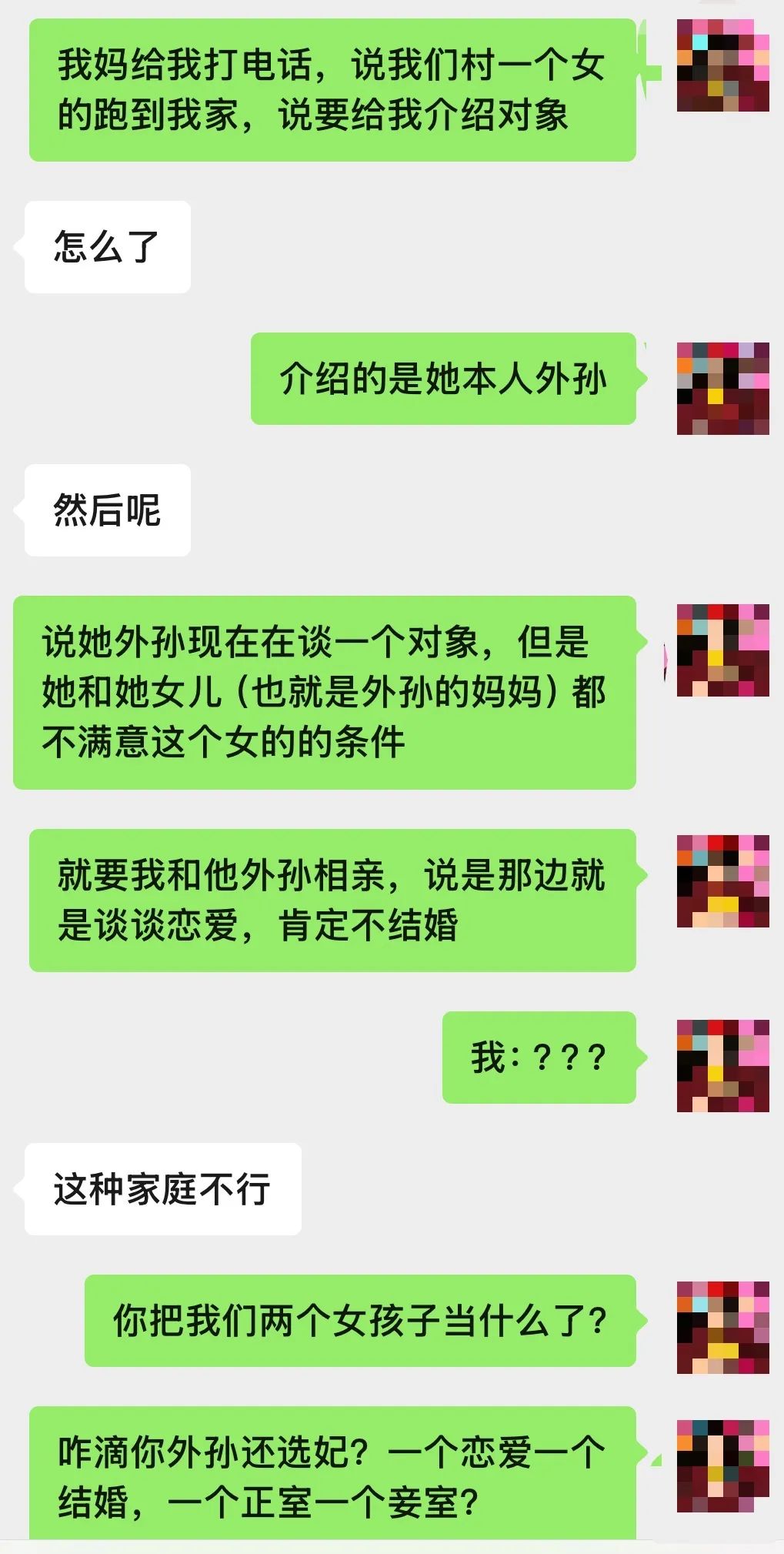 我爸妈的一个朋友,想把她侄子介绍给我,男方是我表姑的前男友。关键是我表姑跟前男友谈恋爱,也是这个阿姨做媒。我妈直接骂了回去,觉得太离谱了。