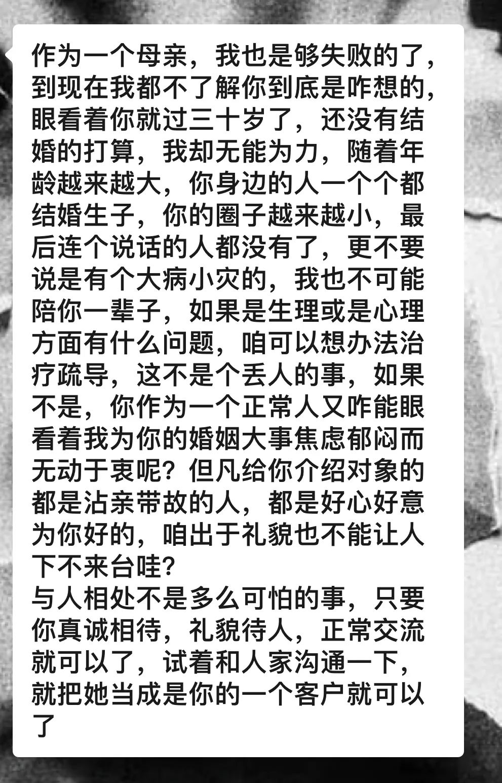 大张妈妈劝他好好和女方聊天说起我对催婚的抗拒,还有个事不得不提。