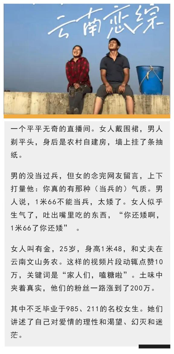 女生小桐在南方某211读汉语言文学,之前关注另一个云南博主小英,同情对方的穷苦和丈夫的不负责任。被室友安利有金夫妇后,她从“紧身裤”的眼神里,觉得看到了对女方的爱。她来自安徽农村,儿时经常目睹父母、祖父母吵架。