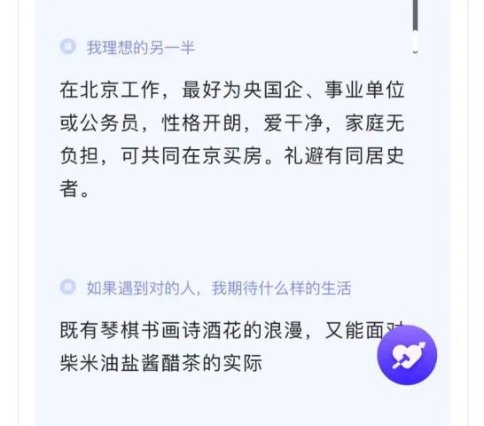 ●何霜在约会软件上看到的男性提出的条件。讲述者供图嗑有金夫妇的几位名校女生,都支持“门当户对”的逻辑。安徽大学的程庆华在硕士学位论文中写到,Z世代女性衡量亲密关系时,更要求家庭背景、学历、外貌、三观的“势均力敌”;人们试图“驯服爱情”,把爱情和爱人变成自己可掌控的、可理解的、使自己舒适的存在,以获取安全稳定。