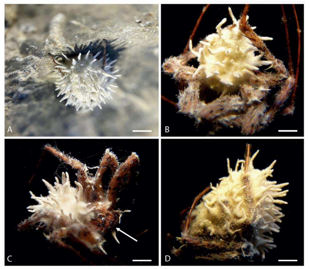在岩壁上、洞穴内被感染的僵尸蜘蛛(来源:文献1)随着感染的进展,真菌在蜘蛛体表形成明显的菌丝层,最终覆盖整个宿主体表。这种菌丝层使得孢子可以更有效地暴露在空气流动中,被风带到更远的地方,从而增加感染扩散范围。科学家表示,这种行为改变是一种高度适应环境的进化策略,使真菌能够更有效地传播其孢子。