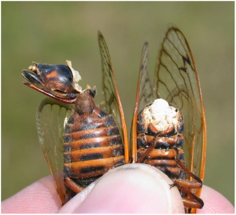 [3]Cooley, John R., David C. Marshall, and Kathy BR Hill. "A specialized fungal parasite (Massospora cicadina) hijacks the sexual signals of periodical cicadas (Hemiptera: Cicadidae: Magicicada)." Scientific Reports 8.1 (2018): 1432.