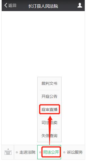 第二步:点击长汀法院官方公众号下方中间“司法公开”菜单——点击“庭审直播”
