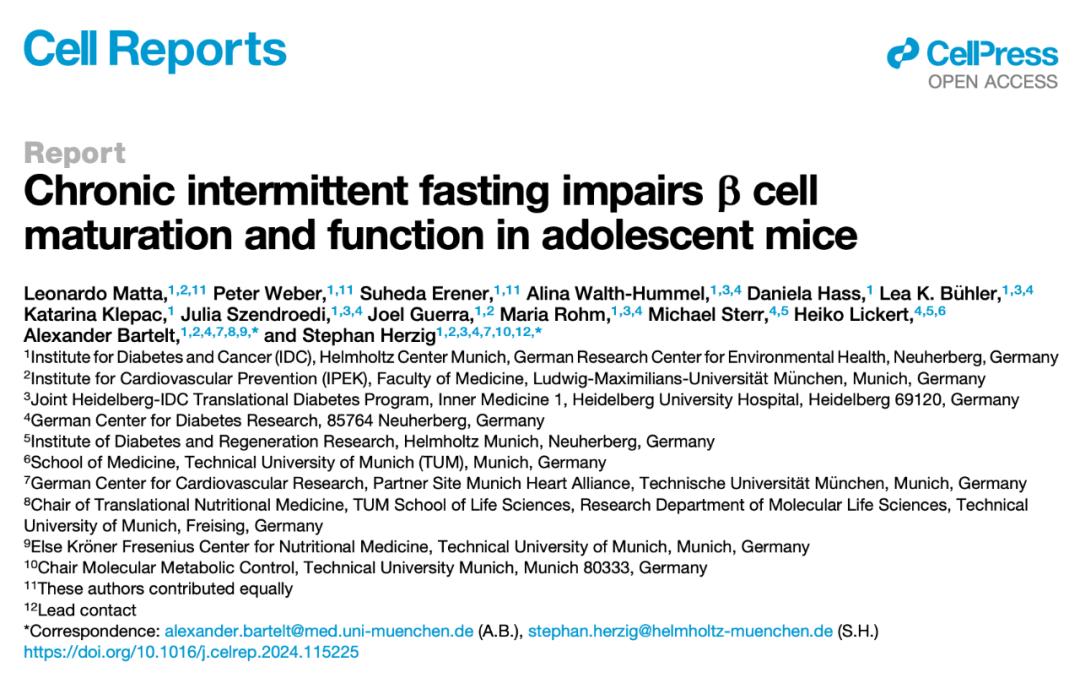 近日,慕尼黑工业大学、慕尼黑大学医院和亥姆霍兹慕尼黑中心的研究人员在 Cell 子刊 Cell Reports 上发表了题为:Chronic intermittent fasting impairs β cell maturation and function in adolescent mice 的研究论文。