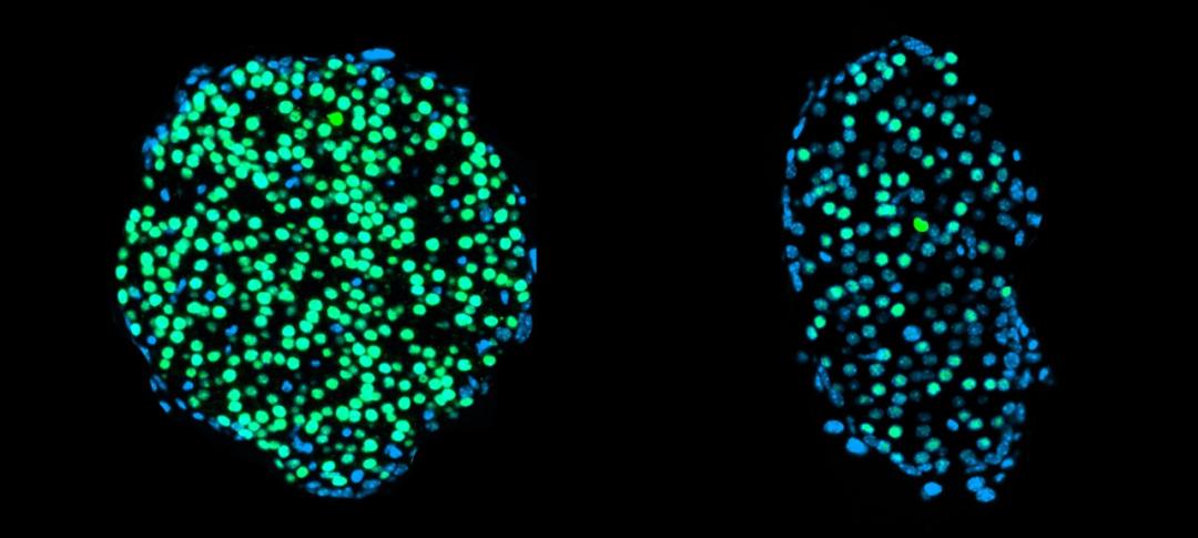 慢性间歇性禁食后的胰岛(左侧为成年小鼠,右侧为年轻小鼠),年轻小鼠在间歇性禁食后胰岛显示出更少的成熟 β 细胞(绿色)。间歇性禁食通常被认为对 β 细胞有益,而这项研究惊讶地发现,青春期小鼠在长期禁食后产生的胰岛素更少。