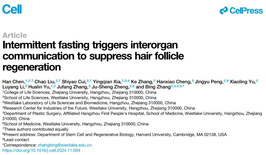 2024年12月13日,西湖大学生命科学学院张兵课题组(博士生陈晗、刘超和崔诗遥为第一作者)在国际顶尖学术期刊 Cell 上发表题为:Intermittent fasting triggers interorgan communication to suppress hair follicle regeneration 的研究论文。