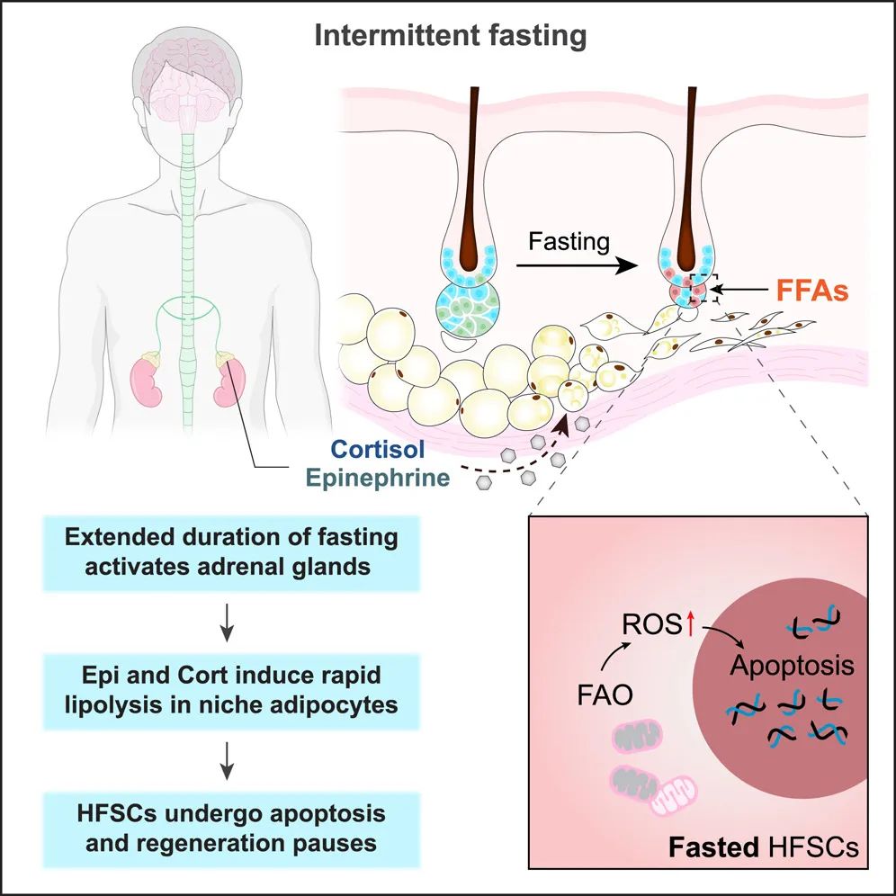 该研究揭示了间歇性禁食对组织再生的抑制作用:在间歇性禁食期间,不稳定的营养供应会触发器官间通讯,并抑制毛囊干细胞(HFSC)的再生活性,从而抑制毛发生长。