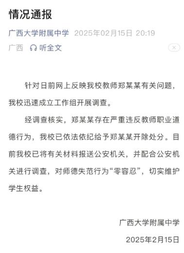 经调查核实,郑某某存在严重违反教师职业道德行为,我校已依法依纪给予郑某某开除处分。目前我校已将有关材料报送公安机关,并配合公安机关进行调查,对师德失范行为“零容忍”,切实维护学生权益。