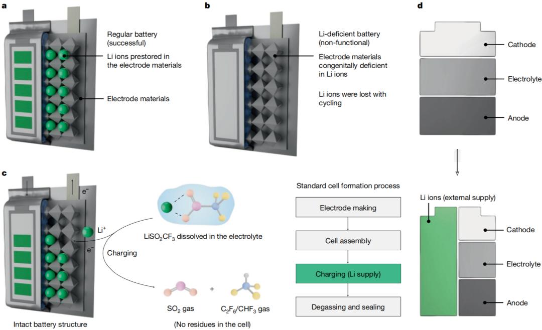 锂离子电池通过为电子设备和电动汽车提供动力,显著推动了全球CO2减排,但随着电气化需求的增加,尤其是在高性能应用和大规模储能领域,电池的能量密度、寿命和材料可用性面临挑战。传统锂离子电池的正极含有锂离子,而负极材料(如石墨)通过嵌入或合金化储存锂离子,但初始状态不含锂。这种设计限制了缺锂正极材料(如过渡金属卤化物、氧化物、有机化合物和硫化物)的应用,尽管这些材料在能量、成本和循环稳定性方面具有优势。其中,电池的初始活性锂离子数量决定了其最大容量,而锂离子在循环过程中的损失限制了电池的使用寿命。现有的预锂化策略存在分解不完全和有害残留物的问题,无法满足要求。因此,需要一种新的锂供应方法,打破电极依赖锂供应的限制,以释放电池在材料发现和寿命方面的潜力。