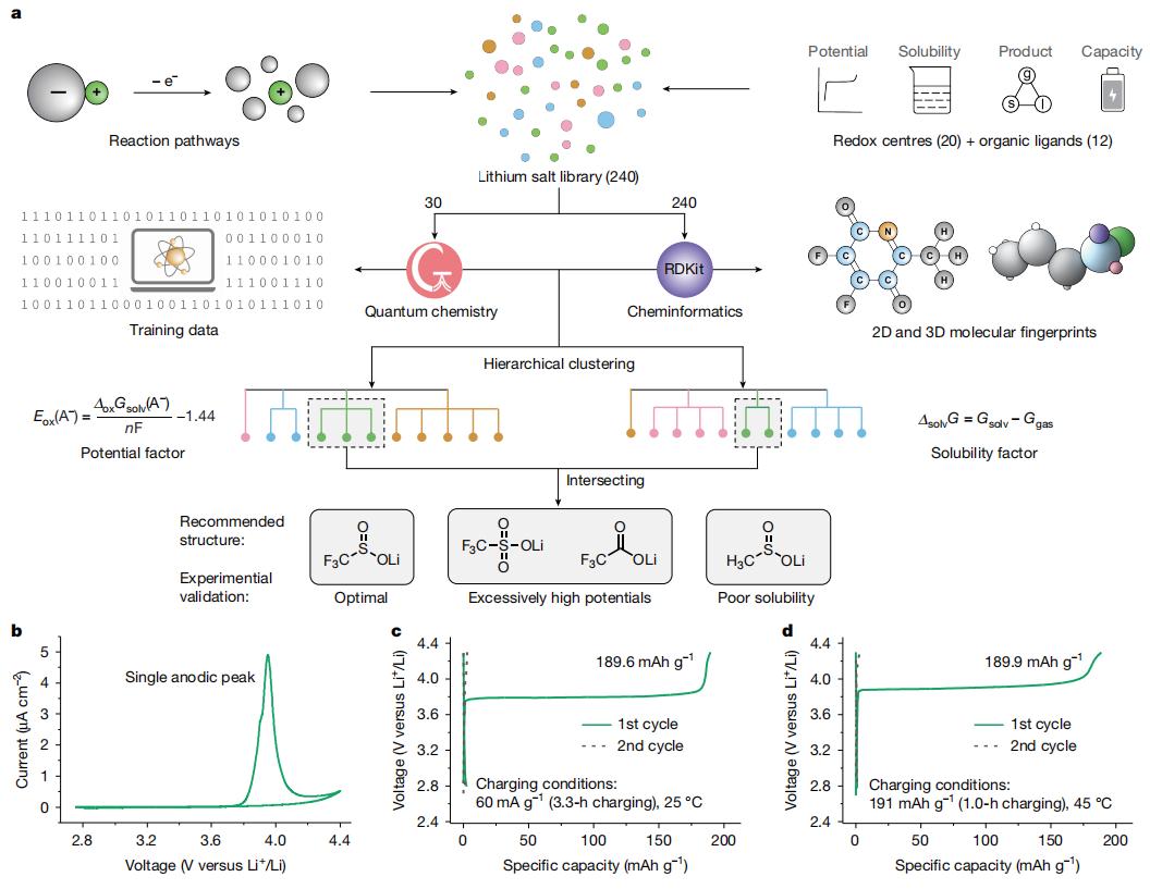 图1. 外部锂供应策略。AI助力用于外部供锂的有机锂盐为了实现外部锂供应的概念,研究人员发现了一种有机锂盐——LiSO2CF3,并验证了其在电池中的应用潜力。通过结合机器学习和有机电化学原理筛选得出这种有机锂盐,满足了外部锂供应的多项严格要求:1)其氧化反应发生在2.8–4.3 V的电压范围内,与电池的充电窗口一致;2)反应不可逆,防止锂离子被重新消耗;3)分解产物为气态,可从电池中排出;4)在电解液中具有良好的溶解性,便于扩散和持续分解;5)同时具备空气稳定性和较高的比容量。