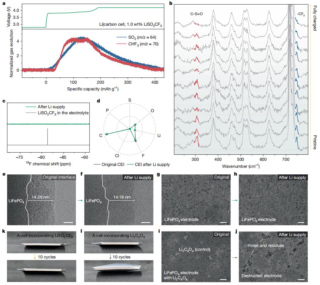 与传统预锂化技术相比,LiSO2CF3的外部锂供应方法具有显著优势。LiSO2CF3在常规电池电压窗口内完全转化,避免了后续循环中的气体生成。相比之下,传统预锂化剂如草酸锂(Li2C2O4)分解缓慢,导致电池膨胀和性能恶化。LiSO2CF3的高纯度(99.99%)和高热稳定性使其在电池中无用量限制,且其电解液与电池电极化学兼容,不会导致粘结剂降解或铝集流体腐蚀。这些特性使得LiSO2CF3成为一种理想的外部锂供应材料,为缺锂电池的锂离子补充提供了一种无残留且非破坏性的方法。