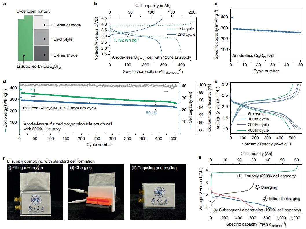图3. 在电池水平上的无残留和无损的锂供应过程。缺锂材料电池的外部锂供应研究人员在无负极软包电池中评估了多种缺锂材料,发现活性锂离子可以作为独立组件集成到电池设计中,并根据需求调整数量。在无负极电池(匹配金属氧化物正极Cr8O21)中展示了3.0 V初始放电电压、1192 Wh kg-1的能量密度;LiNi0.8Mn0.1Co0.1O2与SiO负极配对的电池实现了超过1200次循环的寿命;匹配基于有机硫化聚丙烯腈正极的无负极电池展现出了388 Wh kg-1的能量密度,在循环440次后展现出80.1%的容量保持率。