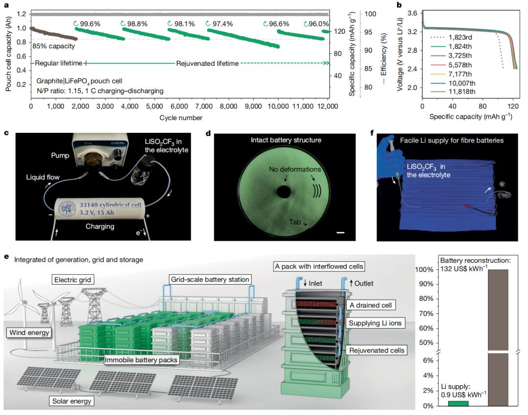 图5. 石墨|磷酸铁锂电池的补锂和在电网储能领域的应用。原文链接:https://doi.org/10.1038/s41586-024-08465-y