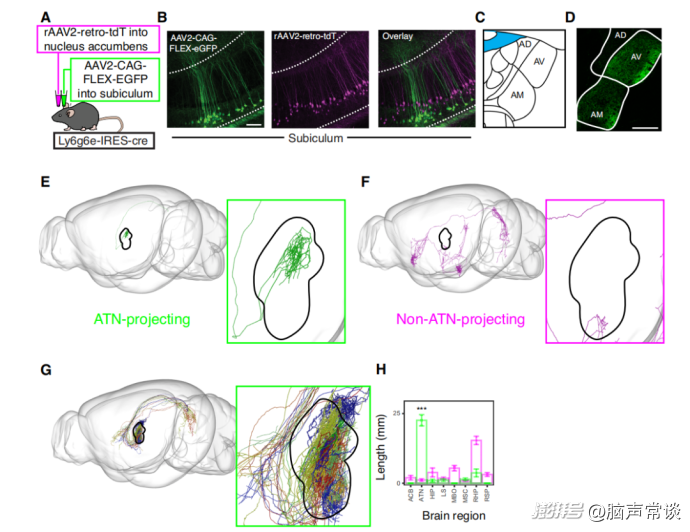 作者构建了转基因Ly6g6e-IRES-Cre小鼠品系选择性地研究卵圆形神经元,。利用依赖Cre的病毒示踪技术,并与研究相对充分的投射到伏隔核的锥体神经元进行对比,证实表达Cre的神经元位于下托的最深层,并且在Ly6g6e - IRES - Cre小鼠中,Cre的表达与Ly6g6e的表达共定位。追踪卵圆形神经元的长程投射,作者发现这类细胞似乎仅投射到丘脑前核(ATN),通过逆行追踪结合多重荧光原位杂交验证表明,在野生型大脑中表达Ly6g6e的下托深层神经元形成了到ATN的投射。接下来分析了单个神经元的全脑轴突投射,能够识别出投射到ATN的下托神经元以及投射到其他部位的神经元。为了系统地分析所有投射,对于每个下托投射神经元,将大脑划分为不同的离散区域,然后计算每个区域内轴突的长度。对这种分区数据进行降维和聚类分析,结果显示有一小群投射神经元与其余下托神经元区分开来。对与这一小群细胞相关的分析表明,这些神经元选择性地靶向ATN,这与卵圆形神经元和锥体神经元具有不同的投射靶点相一致。作者的整体标记结果表明,表达Ly6g6e的卵圆形神经元向ATN发出单一投射,这种关系在多个互补数据集中都表明了卵圆形神经元对ATN的特异性投射。