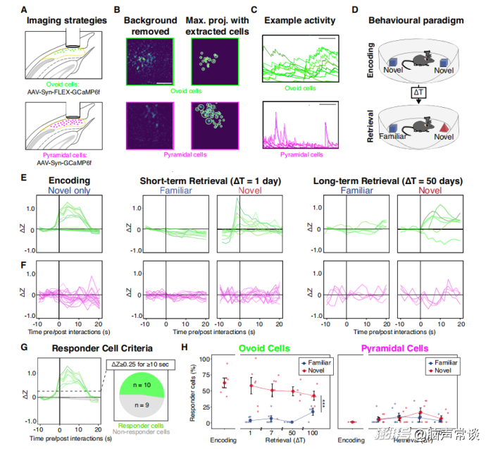 为评估卵圆形神经元与锥体神经元在体内活动的特异性,对Ly6g6e - IRES - cre小鼠注射Cre依赖的GCaMP6f)检测卵圆形神经元活动,同时用非细胞类型特异性方式检测下托广泛活动(主要反映锥体神经元活动)。结果显示卵圆形神经元相对于锥体神经元,具有缓慢、自发且同步的活动。采用物体识别范式训练和测试动物,在编码和检索过程中成像并分析细胞活动。结果发现,卵圆形神经元对新物体有持续群体活动,对熟悉物体则无;而锥体神经元对新、旧物体均无此持续活动。通过量化细胞反应,多数卵圆形神经元对新物体有反应,对熟悉物体反应少,且这种记忆表达可持续数月。多种分析方法及不同病毒和转基因靶向策略均证实卵圆形神经元对新物体反应的选择性。此外,卵圆形神经元对熟悉物体的新空间位置、空间环境变化无反应,对速度和移动性也无强调节,表明其活动对非空间形式的新奇性具有选择性。