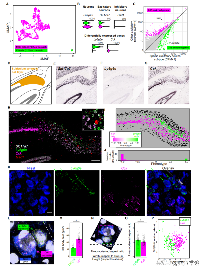 由于下托包含大量通过转录组学定义的兴奋性神经元亚型,作者采用了数据驱动的方法来识别任何特别突出的下托亚型。单细胞转录组的分析表明相对于其他下托神经元,存在一种稀疏且明显偏离的亚型。这类偏离的细胞表达神经元标记物Snap25、兴奋性神经元标记物Slc17a7、Slc17a6和Camk2a,且不表达抑制性神经元标记物Gad1。单个基因的表达就足以将这种偏离的亚型与其他下托神经元区分开来,并且在这种偏离的亚型中有大量基因存在差异表达。发现这种偏离的亚型与多种神经元相关功能有关,这表明其具有高度的功能特化。Cck在锥体神经元层广泛表达,而Ly6g6e的表达与下托的最深部分相关。用于同时检测所有这些基因表达的荧光原位杂交证实,表达Ly6g6e的细胞也表达兴奋性神经元标记物Slc17a7,并且Ly6g6e的表达与抑制性神经元标记物Gad1的表达相互排斥。此外,Ly6g6e和Cck的表达定义了下托内具有相邻且基本不重叠空间区域的不同细胞类型,表达Ly6g6e的神经元位于下托的最深部分。结果显示表达Ly6g6e的神经元似乎更小且呈切向排列。为了分析胞体的几何形状并将这种几何形状与基因表达联系起来,首先使用DAPI和尼氏染色来识别细胞核和相关的胞体,并通过追踪单个细胞体手动分割胞体。分析表明,表达Ly6g6e的胞体总体面积显著减小,同时还有其他几何差异。为了突出这些非典型椭圆形深层细胞与经典锥体神经元之间的差异,将表达Ly6g6e的细胞称为非锥体“卵圆形神经元”。