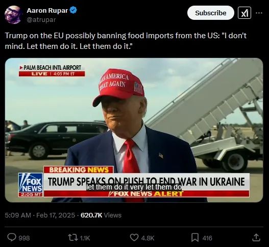 特朗普16日在佛罗里达州棕榈滩国际机场接受采访 X截图16日早些时候,英国《金融时报》引述三名知情官员说法称,针对一些与欧盟奉行不同标准的进口食品,欧盟委员会(欧委会)预计将在下周研究收紧进口限制。报道指出,这很可能包括大豆等美国作物,因为美国种植大豆等农作物时往往会用到百草枯等危害较大的农药,但后者在欧盟是被禁用的。