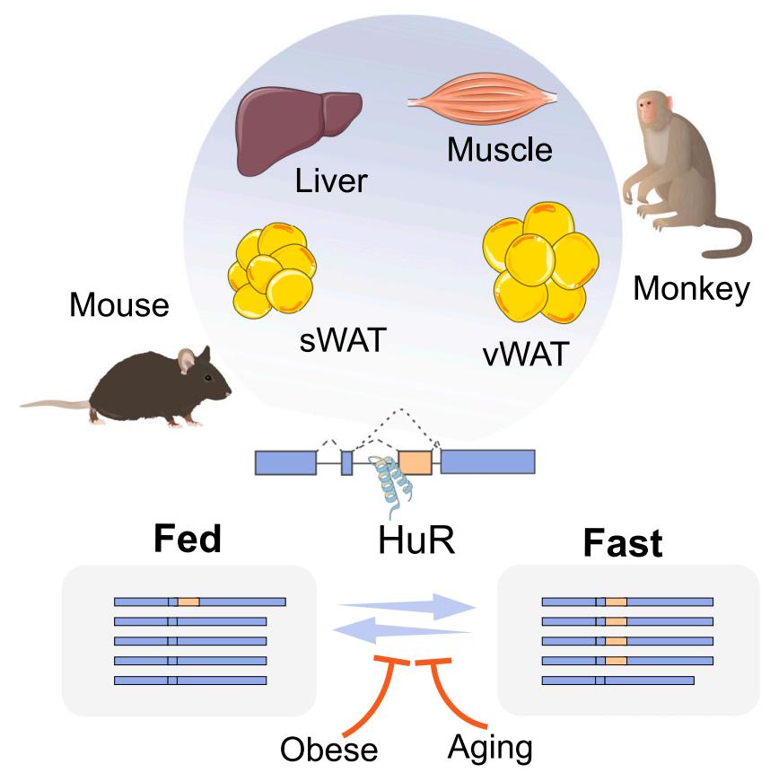2024年2月11日, 杜克-新加坡国立大学医学院孙磊团队与明尼苏达大学徐聃团队在Cell Press细胞出版社旗下期刊Cell Metabolism在线发表了题为“Isoform Usage as a Distinct Regulatory Layer Driving Nutrient-Responsive Metabolic Adaptation”的研究论文。该研究通过分析小鼠、猕猴不同营养状态下的测序数据,首次全局系统性解析了剪接异构体在营养代谢过程中的动态变化, 并发现衰老与肥胖显著削弱异构体的调控适应能力。通过预测并实验证实RNA结合蛋白HuR在脂肪组织异构体调控网络中的核心作用, 为理解生物营养适应和研究代谢疾病的发生机制提供了全新的视角。
