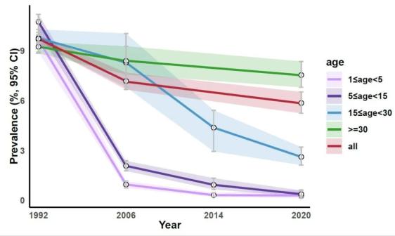 最新全国血清学调查数据显示,我国HBsAg流行率已降至5.86%,较1992年的9.72%下降近40%(图1)。其中,5岁以下儿童的流行率降速最快,从1992年的9.67%下降至2020年的0.30%,降幅超过96%。