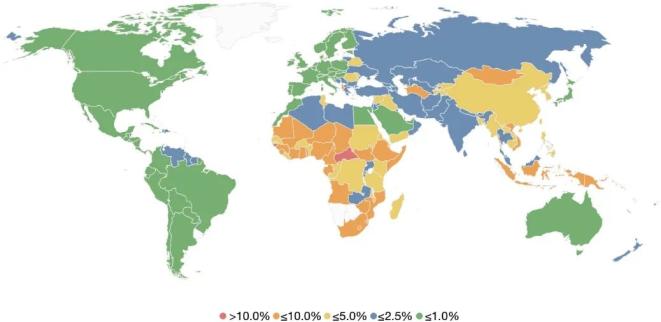 图1. 1992-2020年我国各年林组HBsAg流行率变化趋势我国曾是乙型肝炎高度流行地区(WHO定义为HBsAg流行率≥8%),通过全面实施疫苗接种、安全注射、血液筛查和强化监测等措施,目前已降至中等偏高流行水平(图2)。