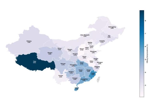 图3. 中国主要地区/省份HBsAg流行率(2006–2021)