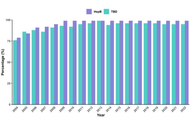 图5. 2004-2022年我国乙肝疫苗接种情况(HepB:乙肝疫苗;TBD:出生后24小时内接种第一剂乙肝疫苗)