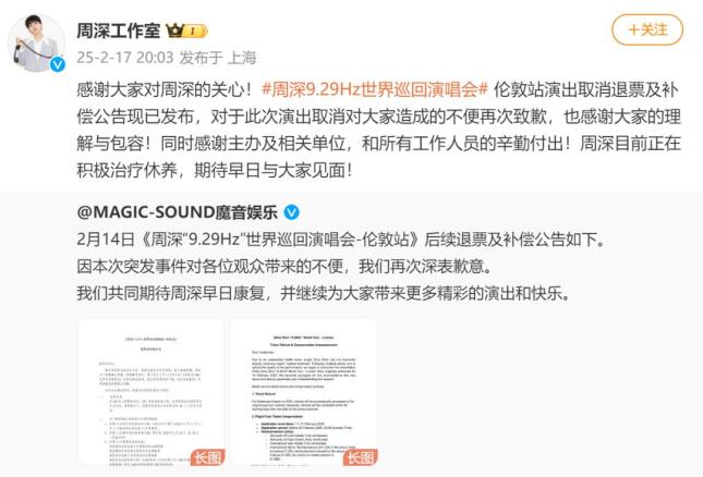 2月17日晚,@MAGIC-SOUND魔音娱乐 发布2月14日《周深“9.29Hz”世界巡回演唱会-伦敦站》后续退票及补偿公告。其表示,因本次突发事件对各位观众带来的不便,再次深表歉意。“我们共同期待周深早日康复,并继续为大家带来更多精彩的演出和快乐。”